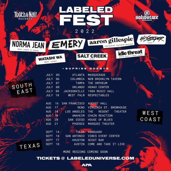 The lineup has been revealed for the 2022 Labeled Fest tour. The trek will feature Norma Jean, Emery, Aaron Gillespie (Underoath), Oh, Sleeper, Watashi Wa, Salt Creek, and Idle Threat on select dates.