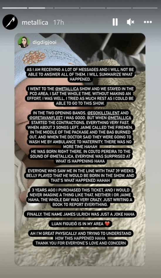 During Metallica‘s May 7 show in Curitiba, Brazil, a fan named Joice M. Figueiró ended up giving birth while the band were onstage. The woman, who was 39 weeks pregnant, says she was feeling fine during the opening acts, but when Metallica took the stage she started having contractions and her water broke before she could be taken to a hospital. The baby was born while the band were performing “Enter Sandman.” Metallica shared a translated version of Figueiró’s story on Instagram: