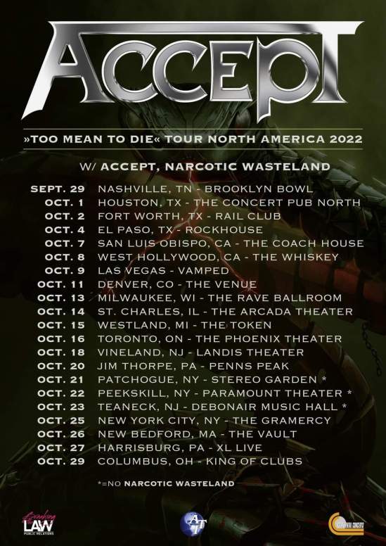 Accept have announced a headlining North American tour. Narcotic Wasteland will open.