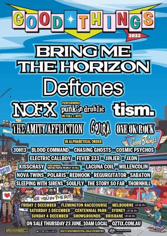 The lineup has been revealed for the 2022 Good Things Festival. The event will be held in Australia this December and it will feature: Bring Me The Horizon, Deftones, NOFX (performing “Punk In Drublic”), TISM, The Amity Affliction, Gojira, One Ok Rock, 3OH!3, Blood Command, Chasing Ghosts, Cosmic Psychos, Electric Callboy, Fever 333, Jinjer, JXDN, Kisschasy (performing “United Paper People“), Lacuna Coil, Millencolin, Nova Twins, Polaris, Redhook, Regurgitator, Sabaton, Sleeping With Sirens, Soulfly, The Story So Far, and Thornhill. Here’s the dates: