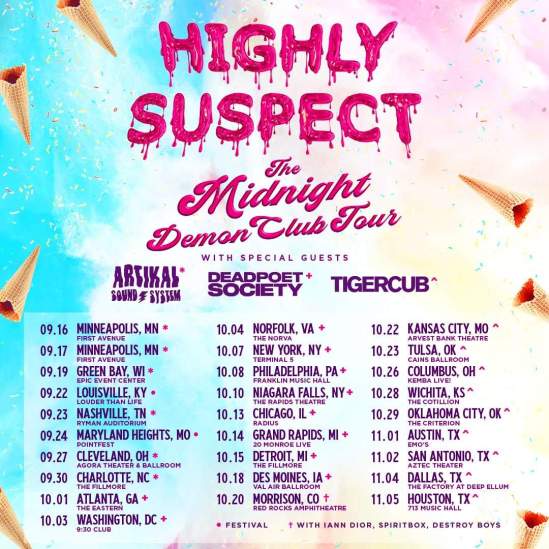 Highly Suspect have announced a fall tour in support of their new album “The Midnight Demon Club” (out September 9). Artikal Sound System, Dead Poet Society, and Tigercub will open on select dates.