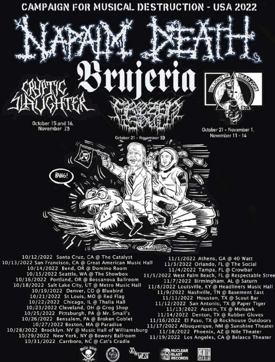 Napalm Death have announced a fall tour with Brujeria. Frozen Soul, Cryptic Slaughter, and MDC will also perform on select dates.