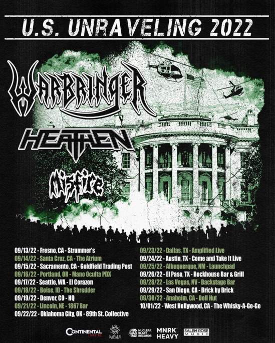 Warbringer have announced a headlining West Coast tour. Heathen and Misfire will open.