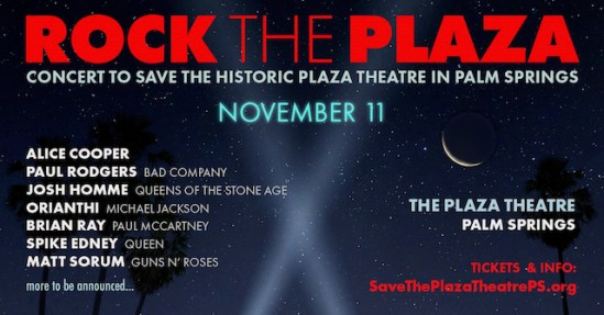 A special “Rock The Plaza” benefit concert has been organized to help save the Plaza Theatre in Palm Springs, CA. The event will be held at the venue on November 11 and it will feature an all-star band called The Palm Springs All Stars. That group is composed of Spike Edney (Queen), Brian Ray (Paul McCartney), and Matt Sorum (ex-Guns N’ Roses). A number of special guests will also take part including: Alice Cooper, Paul Rodgers (Bad Company), Josh Homme (Queens Of The Stone Age), Orianthi (ex-Alice Cooper), Jon Button (The Who), Pete Thorn (Chris Cornell, Melissa Etheridge, etc.), and Teddy ‘Zig Zag’ Andreadis (ex-Guns N’ Roses). On top of that, an online auction featuring items from Brian May (Queen), Adam Lambert, Alice Cooper, and more will also be launched around the concert. More details can be found HERE.