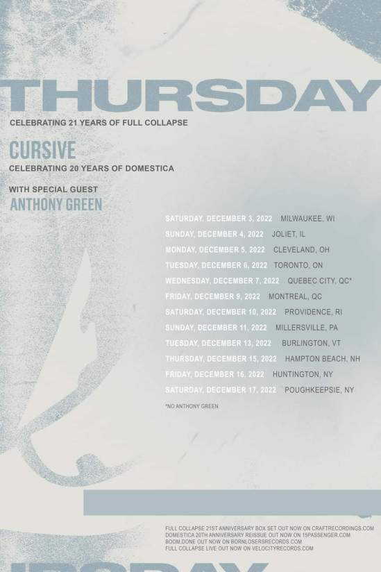 Thursday, Cursive, and Anthony Green (Circa Survive) have announced a December North American tour. The trek will find Thursday performing “Full Collapse” and Cursive performing “Domestica.” Here’s the dates: