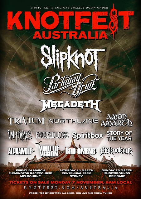 Slipknot will be hosting three Knotfest events in Australia next year. The shows will take place in March and they will feature: Slipknot, Parkway Drive, Megadeth, Trivium, Northlane, Amon Amarth, In Flames, Knocked Loose, Spiritbox, Story Of The Year, Alpha Wolf, Void Of Vision, Bad Omens, and Malevolence. Here’s the dates: