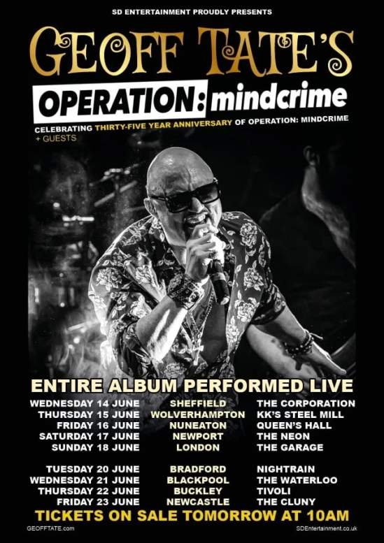 Ex-Queensrÿche singer Geoff Tate will be celebrating the 35th anniversary of “Operation: Mindcrime” by performing it in full during a June UK tour. Here’s the dates: