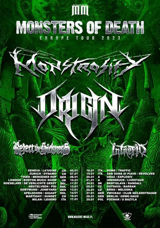 Monstrosity and Origin have been confirmed as the co-headliners for next year’s “Monsters Of Death European Tour.” Reject The Sickness and Intrepid will open.