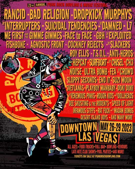 The lineup has been revealed for next year’s Punk Rock Bowling & Music Festival. The event will take place in Las Vegas, NV on May 26-29 and it will feature the following: Rancid, Bad Religion, Dropkick Murphys, The Interrupters, Suicidal Tendencies, The Damned, L7, Me First And The Gimmie Gimmes, Face To Face, GBH, The Exploited, Fishbone, Agnostic Front, Cockney Rejects, The Slackers, Roy Ellis, T.S.O.L., Anti-Heros, Hepcat, Surfbort, The Chisel, CH3, Noi!se, Ultra Bomb, Fea, The Crowd, Sloppy Seconds, End It, Suzi Moon, Svetlanas, Playboy Manbaby, Doki Doki, The Venomous Pinks, Rough Kids, The Dollheads, Dee Skusting & The Rodents, Speed Of Light, Infamous Stiffs, Rat Fuck, The Madam Bombs, and Desert Island Boys.