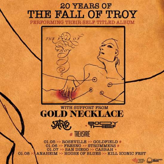 We are gonna play all the shit we never play, and some others as well. The lineup is stacked with Gold Necklace, Satyr, Body Thief and TREASVRE, so put on your girl jeans, bust out that flat iron, make sure the studded belt is tight and come get wild with us. Tickets here: https://www.bandsintown.com/a/470-the-fall-of-troy/.”