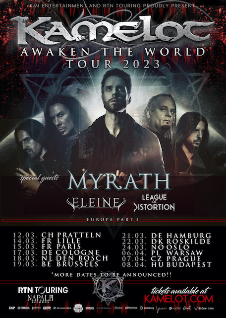 “Kamelot legions Europe! We are pleased to announce cities for our first round of the ‘Awaken The World’ tour 2023! Special guests will be the mighty Myrath and openers Eleine, along with League Of Distortion. We’re thrilled to share this information just in time for Christmas!”