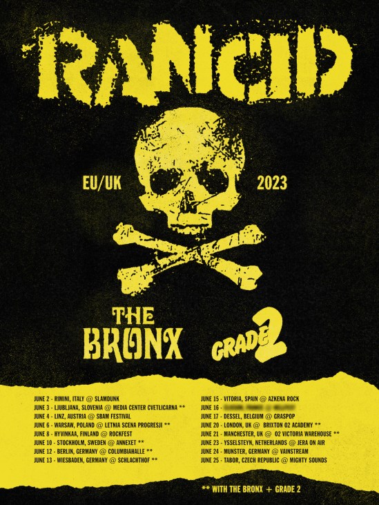 Rancid have announced a European/UK tour. The Bronx and Grade 2 will open on select dates.
