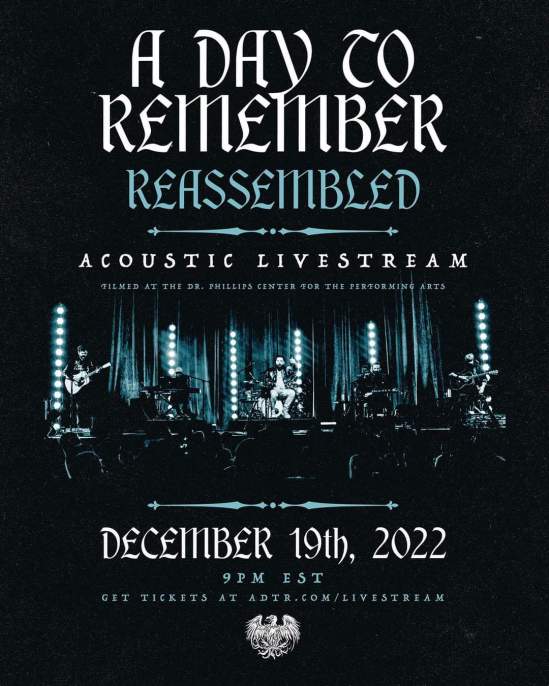 “Join us on Dec 19th as we broadcast the final stop on our acoustic theater tour live from Dr. Phillips Center for the Performing Arts in Orlando! These shows have been truly special and we’re excited for the opportunity to share reimagined versions of our songs with the entire world. Tickets are on sale now at adtr.com/livestream“