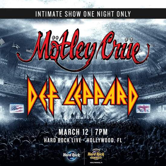 Mötley Crüe and Def Leppard have booked an “intimate show” at the Hard Rock Live in Hollywood, Florida. The event will take place on March 12 and fans will be able to get presale tickets on January 10 at 10 a.m. General tickets will be available on January 13 at 10 a.m.
