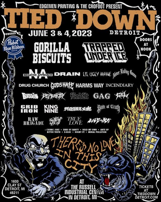 The lineup has been revealed for this year’s Tied Down festival. The event will take place at The Russell Industrial Center in Detroit, MI on June 3-4 and it will feature: Gorilla Biscuits, Trapped Under Ice, Negative Approach, Drain, Lil Ugly Mane, Never Ending Game, Ante Up, Buggin, Cosmic Joke, D-Bloc, Deadbody, Doubt It!, Drug Church, End It, Ends Of Sanity, Gag, Gel, God’s Hate, Gridiron, Harm’s Way, Hold My Own, Incendiary, King Nine, Magnitude, Moral Pollution, Pain Of Truth, Raw Brigade, Spy, True Love, and Warfare.