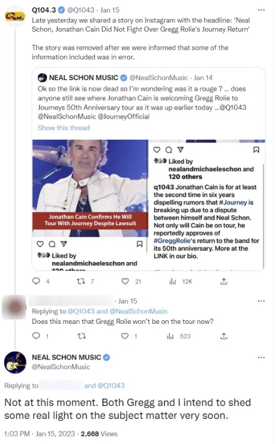 It appears former Journey keyboardist Gregg Rolie will not be taking part in the band’s 50th anniversary tour. Guitarist Neal Schon confirmed the news after a fan commented on a removed article from Q104.3, which suggested that current keyboardist Jonathan Cain was okay with Rolie’s return. Schon said the following: