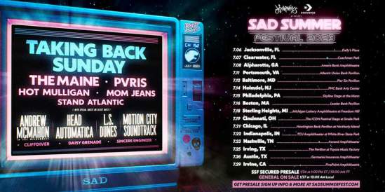 The lineup has been revealed for this year’s Sad Summer Fest tour. The trek will take place this July and it will feature: Taking Back Sunday, The Maine, PVRIS, Hot Mulligan, Mom Jeans, and Stand Atlantic. Andrew McMahon In The Wilderness, Head Automatica, L.S. Dunes, Motion City Soundtrack, Cliffdiver, Daisy Grenade, and Sincere Engineer will also perform on select dates.