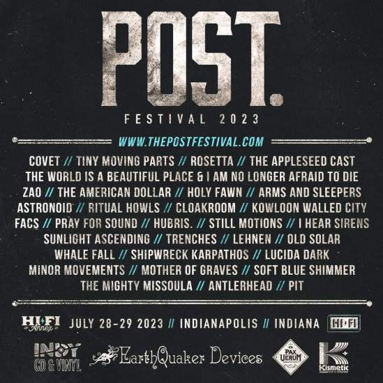 More bands have been added to this year’s Post. Festival. The event will take place at the HI-FI Annex in Indianapolis, IN on July 28-29 and it will now feature the following: Covet, Tiny Moving Parts, Rosetta, The Appleseed Cast, The World Is A Beautiful Place And I Am No Longer Afraid To Die, Zao, The American Dollar, Holy Fawn, Arms And Sleepers, Astronoid, Ritual Howls, Cloakroom, Kowloon Walled City, Facs, Pray For Sound, Hubris., Still Motions, I Hear Sirens, Sunlight Ascending, Trenches, Lehnen, Old Solar, Whale Fall, Shipwreck Karpathos, Lucidia Dark, Minor Movements, Mother Of Graves, Soft Blue Shimmer, The Mighty Missoula, Antlerhead, and Pit.