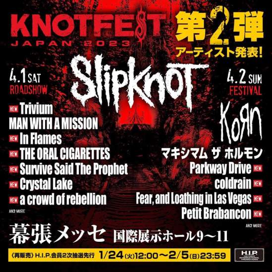 More bands have been added to this year’s edition of Knotfest Japan. The event will take place at the Makuhari Messe International Exhibition Hall near Tokyo, Japan on April 1-2 and the updated daily lineups can be found below: