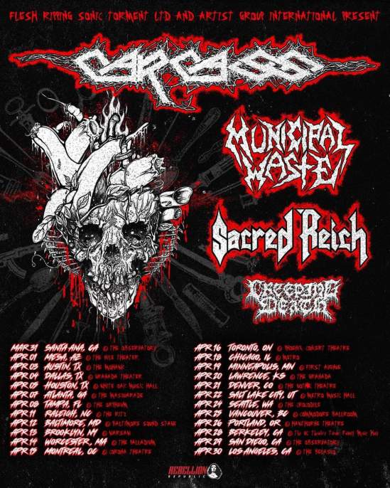 Carcass have announced a headlining North American tour. Municipal Waste, Sacred Reich, and Creeping Death will serve as support.