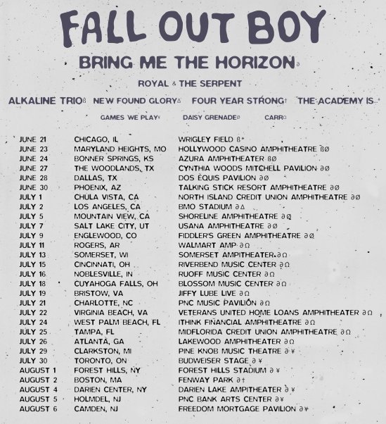 Fall Out Boy have announced a headlining North American tour. Bring Me The Horizon, Royal & The Serpent, Alkaline Trio, New Found Glory, Four Year Strong, The Academy Is…, Daisy Grenade, CARR, and Games We Play will serve as support on select dates.