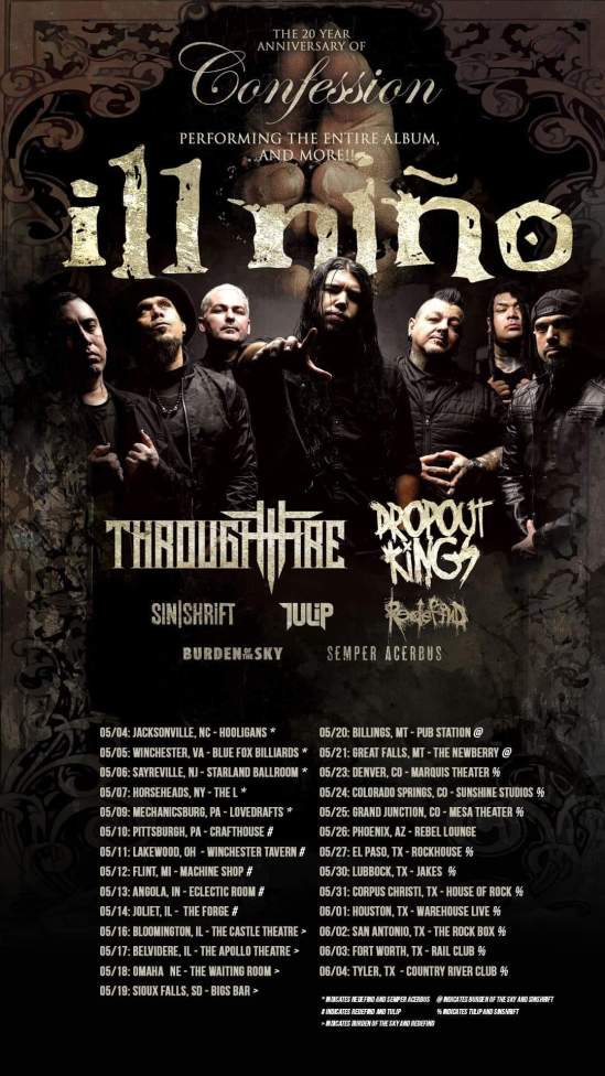 Ill Niño will be celebrating the 20th anniversary of “Confession” during a spring tour with Through Fire and Dropout Kings. Sinshrift, Tulip, Redefind, Burden Of The Sky, and Sempter Acerbus will also perform on select dates.