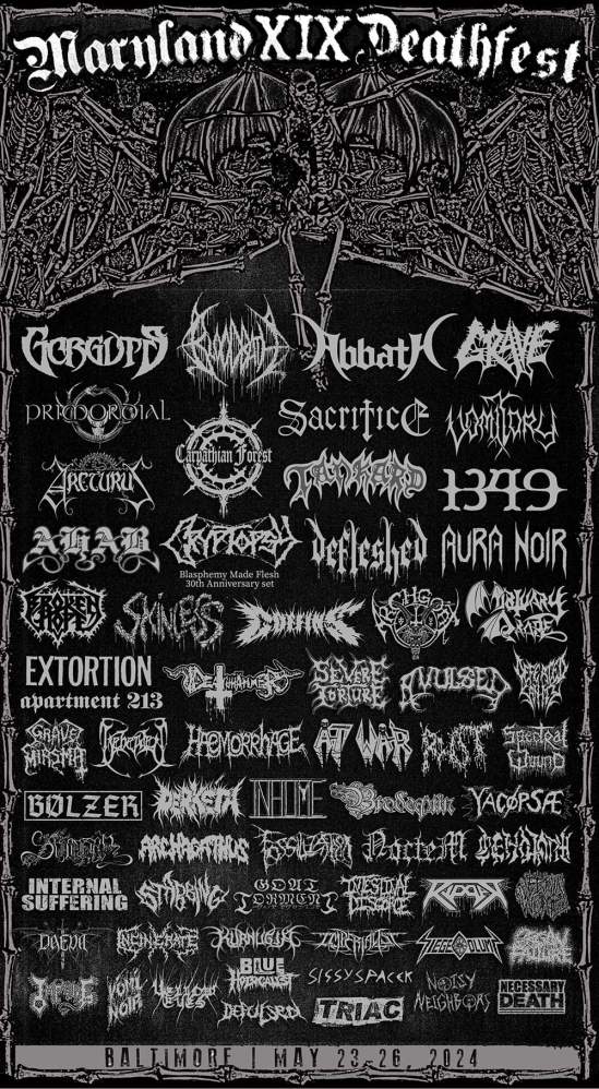 More bands have been added to next year’s Maryland Deathfest. The event will take place in Baltimore, Maryland on May 23-26 and it will now feature: 1349, Abbath, AHAB, Apartment 213, Archagathus, Archgoat, Arcturus, At War, Aura Noir, Avulsed, Beheaded, Bloodbath, Blue Holocaust, Bölzer, Brodequin, Broken Hope, Carpathian Forest, Cenotaph, Coffins, Cryptopsy (“Blasphemy Made Flesh” 30th anniversary), Daeva, Deathhammer, Defeated Sanity, Defleshed, Depulsed, Derkéta, Extortion, Fossilization, Goat Torment, Gorguts, Grave, Grave Miasma, Haemorrhage, Imperialist, Impure, Incinerate, Inhume, Internal Suffering, Intestinal Disgorge, Kurnugia, Mortuary Drape, Necessary Death, Noctem, Noisy Neighbors, Organ Failure, Primordial, Ripper, ROT, Sacrifice, Severe Torture, Siege Column, Sinmara, Sissy Spacek, Skinless, Spectral Wound, Stabbing, Tankard, Triac, Vermin Womb, Vomitory, Vomi Noir, Yacøpsæ, and Yellow Eyes.