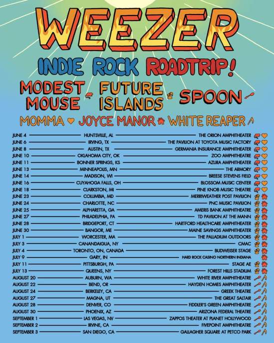 Weezer have announced the dates for their “Indie Rock Roadtrip” tour. The trek will find the band joined by Modest Mouse, Future Islands, Spoon, Momma, Joyce Manor, and White Reaper on select dates.