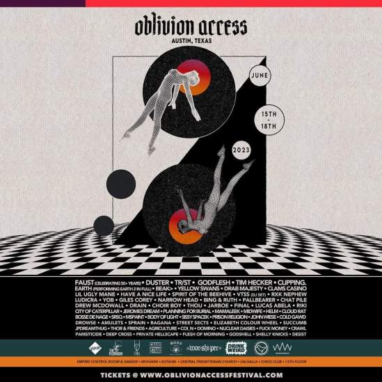 More bands have been added to this year’s Oblivion Access festival. The event will take place across Central Presbyterian Church, Mohawk, and Elysium & Valhalla in Austin TX on June 15-18 and it will now feature the following: Faust (50th anniversary set), Duster, TR/ST, Godflesh, Tim Hecker, Clipping., Earth (performing “Earth 2“), Beak>, Yellow Swans, Drab Majesty, Clams Casino, Lil Ugly Mane, Have A Nice Life, Spirit of The Beehive, VTSS, RXK Nephew, Ludicra, YOB, Giles Corey, Narrow Head, Bing & Ruth, Pallbearer, Chat Pile, Drew McDowall, Drain, Choir Boy, Thou, Jarboe, Final, Lucas Abela, Riki, City Of Caterpillar, Jeromes Dream, Planning For Burial, Mamaleek, Midwife, Helm, Cloud Rat, Bosse de Nages, SRSQ, MSPAINT, Body Of Light, Sissy Spacek, Prison Religion, John Wiese, Cold Gawd, Drowse, Amulets, Sprain, Ragana, Street Sects, Elizabeth Colour Wheel, Succumb, Jpdreamthug, Thor & Friends, Agriculture, Coin, Domino, Nuclear Daisies, Fuck Money, Crawl, Parasiticide, Deep Cross, Private Hellscape, Flesh Of Morning, Godshell, Shelly Knicks, and Desist.