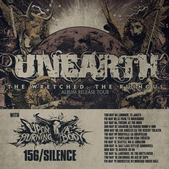 Unearth have announced a headlining U.S. tour with Upon A Burning Body and 156/Silence. The band will be touring in support of their new album “The Wretched; The Ruinous” (out May 5). Here’s the dates: