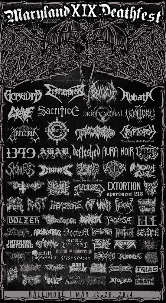 More bands have been added to next year’s Maryland Deathfest. The event will take place in Baltimore, Maryland on May 23-26 and it will now feature the following: 1349, Abbath, AHAB, Apartment 213, Archagathus, Archgoat, Arcturus, Artificial Brain, At War, Aura Noir, Avulsed, Beheaded, Bloodbath, Blue Holocaust, Bölzer, Brodequin, Broken Hope Carpathian Forest, Cenotaph, Coffins, Contaminated, Cryptopsy (performing “Blasphemy Made Flesh”), Daeva, Deathhammer, Defeated Sanity, Defleshed, Depulsed, Derkéta, Dismember, Dragged Into Sunlight (performing “Hatred For Mankind”), Dread Sovereign, Extortion, Fossilization, Goat Torment, Gorguts, Grave, Grave Miasma, Haemorrhage, Imperialist, Impure, Incinerate, Inhume, Internal Suffering, Intestinal Disgorge, Kontusion, Kurnugia, Mortuary Drape, Necessary Death, Noctem, Noisy Neighbors, Organ Failure, Perdition Temple, Primordial, Ripper, ROT, Sacrifice, Severe Torture, Siege Column, Sinmara, Sissy Spacek, Skinless (performing tracks from “Progression Towards Evil” and “Foreshadowing Our Demise“), Spectral Wound, Spirit Possession, Stabbing, Tankard, Triac, Vermin Womb, Vomitory, Vomi Noir, Yacøpsæ, and Yellow Eyes.