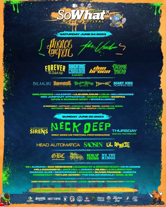 June 25: Neck Deep, Sleeping With Sirens, Thursday (“War All The Time“ set), Head Automatica, Saosin, Lil Darkie, GothBoiClique, Maylene And The Sons Of Disaster, Real Friends, We The Kings, ’68, Alesana, Bad Neighbors, Blessed By A Broken Heart, He Is Legend, Hellogoodbye, Jake Hill, Jasiah, Jeleel!, Kxllswxtch, Nascar Aloe, Deathproof, Oceano, Oliver Francis, Omerta, Poorstacy, Taylor Acorn, The Color Morale, Woe, Is Me, Deep Incision, Her Name Is Karma, Limbs, Slow Pulse, Tracheotomy, and VCTMS.