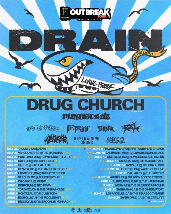 The opening acts have been revealed for Drain’s upcoming North American tour. They include: Drug Church, Magnitude, Outta Pocket, MSPAINT, Torena, GEL, Combust, Restraining Order, and Gumm.