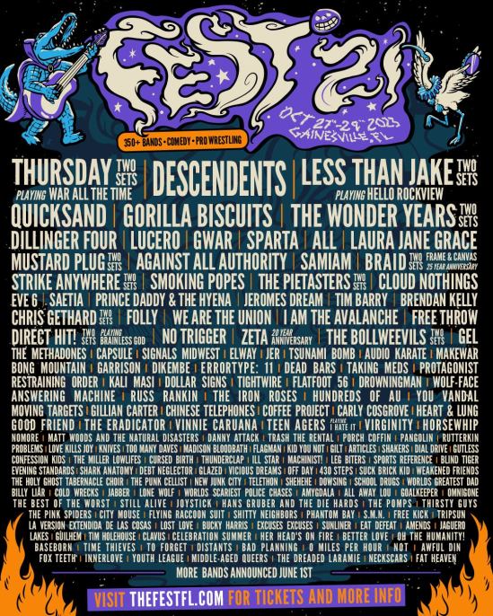 The initial lineup has been revealed for this year’s edition of The Fest. The event will take place in Gainesville, FL on October 27-29 and it will feature the following: Thursday (two sets including “War All The Time” performance), Descendents, Less Than Jake (two sets including “Hello Rockvie” performance), Quicksand, Gorilla Biscuits, The Wonder Years (two sets), Dillinger Four, Lucero, GWAR, Sparta, All, Laura Jane Grace, Against All Authority, Samiam, Mustard Plug (two sets), Braid (two sets including “Frame & Canvas” performance), Strike Anywhere (two sets), The Pietasters (two sets), Smoking Popes, Cloud Nothings, Eve 6, Saetia, Prince Daddy & The Hyena, Jeromes Dream, Tim Barry, Brendan Kelly, Chris Gethard (two sets), Folly, We Are The Union, I Am The Avalanche, Free Throw, Direct Hit! (two sets including “Brainless God” performance), No Trigger, Zeta, The Bollweevils (two sets), Gel, The Methadones, Capsule, Signals Midwest, Elway, Jer, Tsunami Bomb, Audio Karate, Makewar, Bong Mountain, Garrison, Dikembe, Errortype: 11, Dead Bars, Taking Meds, Protagonist, Restraining Order, Kail Masi, Dollar Signs, Tightwire, Flatfoot 56, Drowningman, Wolf-Face, and more.