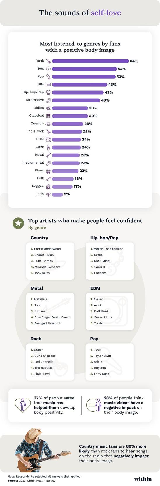 According to a new study by WithinHealth, fans of rock music have a higher chance of having a positive body image. In fact, 64% of those with a positive body image in the study listened to rock music. However, that number drops to 23% for metal fans. Queen, Guns N’ Roses, Led Zeppelin, The Beatles, and Pink Floyd were said to be the rock artists that made people feel the most confident, while Metallica, Tool, Nirvana, Five Finger Death Punch, and Avenged Sevenfold were said to be the “metal” artists that made people feel the most confident.