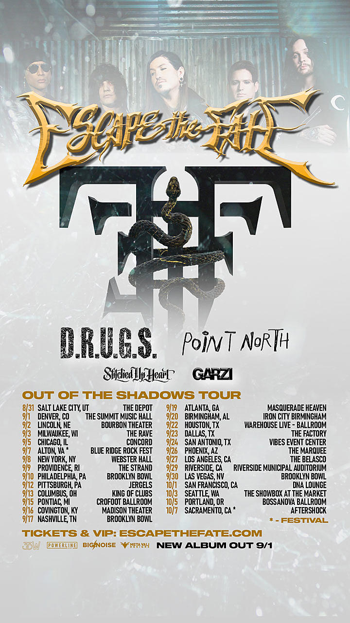 Escape The Fate have announced a headlining U.S. tour with D.R.U.G.S., Point North, Stitched Up Heart, and Garzi. The band will be touring in support of their new album “Out Of The Shadows,” which will be released on September 1.