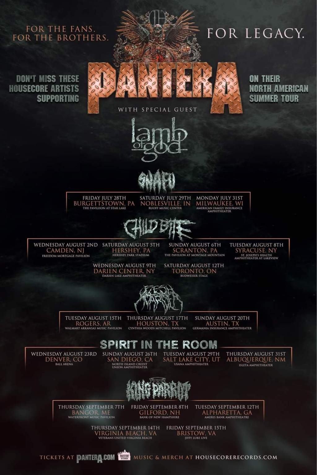 The opening acts have been revealed for Pantera and Lamb Of God’s upcoming North American tour. Child Bite, King Parrot , Spirit In The Room, S.N.A.F.U., and Flesh Hoarder will join the trek on select dates.