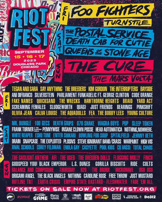 September 15: Foo Fighters, Turnstile, Tegan And Sara, Say Anything, The Breeders, Kim Gordon, The Interrupters, Bayside, Ani Difranco, Silverstein, Parliament Funkadelic feat. George Clinton, Code Orange, Fake Names, Quicksand, The Wrecks, Hawthorne Heights, Braid, Yard Act, Screaming Females, Sludgeworth, Quasi, Just Friends, Bearings, Pinkshift, Olivia Jean, Calva Louise, The Aquadolls, Fea, The Bobby Lees, and Young Culture.
