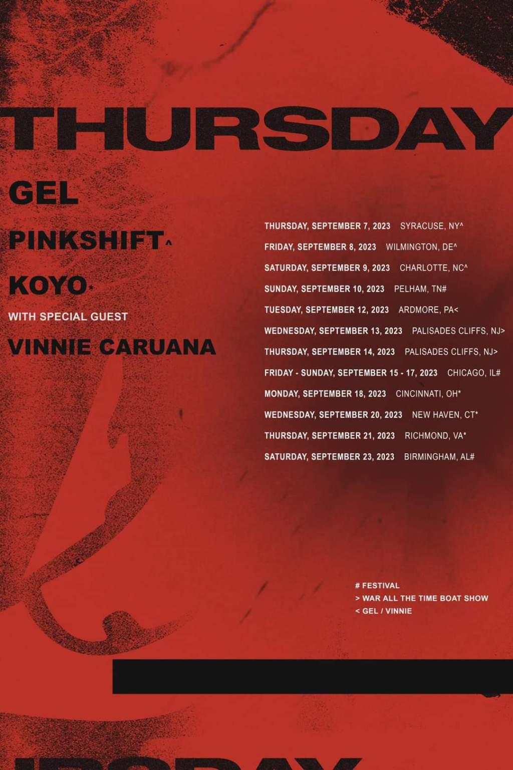 Thursday have announced a September U.S. tour. Gel and Vinnie Caruana will join them at most headlining shows. Pinkshift and Koyo will also perform on select dates. Here’s where you can catch them: