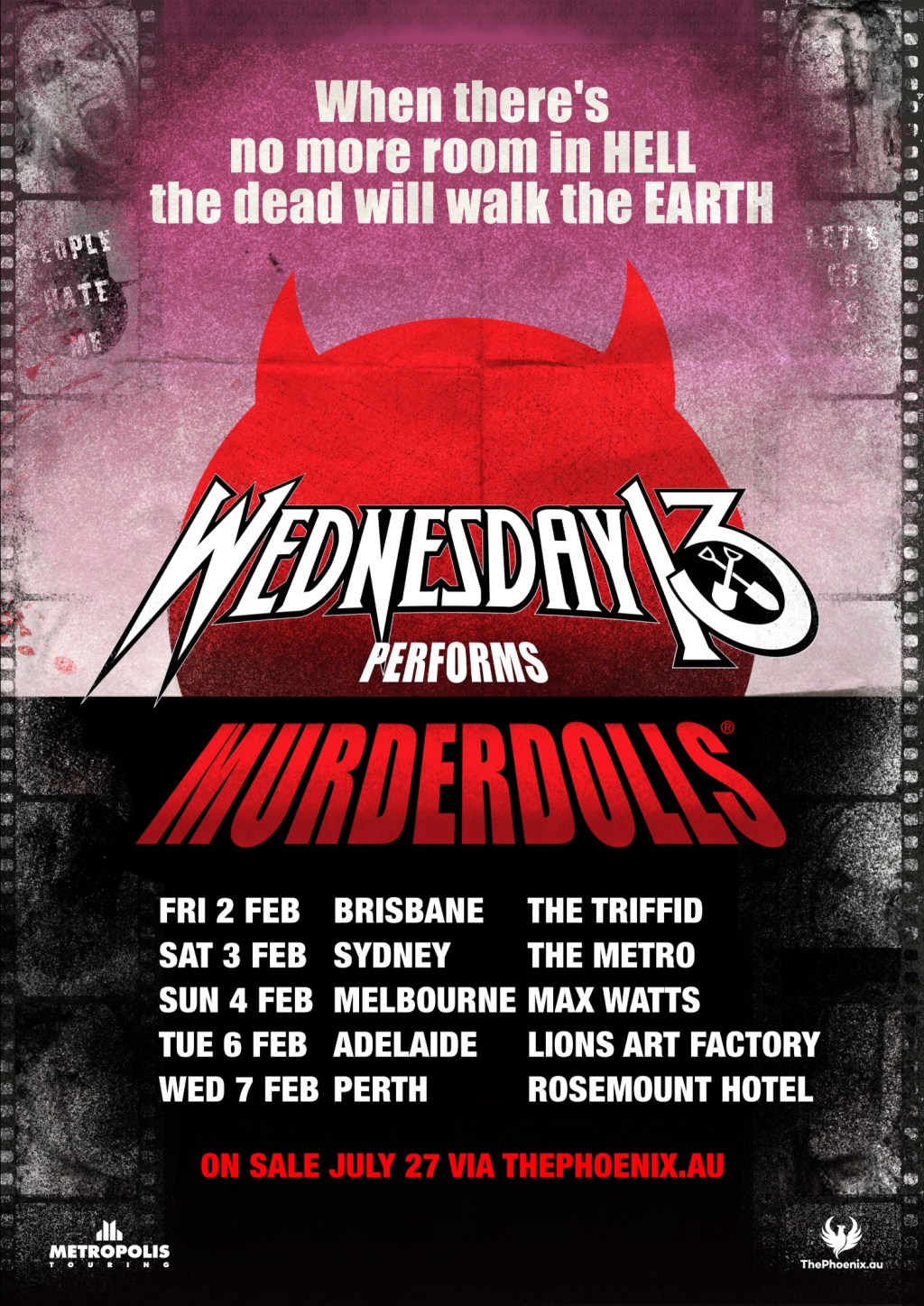 Murderdolls frontman Wednesday 13 will be performing songs from “Beyond The Valley Of The Murderdolls” and “Women And Children Last” during a February Australian tour. Here’s the dates: