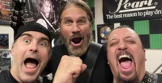 “I [was] doing a one-off [show], [filling in as the guitar player for] OVERKILL, and this is just right after things are opening up. It’s in Jersey, so we go up to Dingbatz, or what’s… there’s the bar and then there’s the venue. So whatever the bar is, we go to the bar. And Orlando comes and meets us, and it’s Corey Pierce from GOD FORBID. And so we’re there all getting loaded. And at a certain point, it was just, like, ‘Man, we got the band right here, man. Why don’t we do something? Why don’t we write music together?’ And we’re all, ‘Yeah, let’s do.’ And then the next day, we’re kind of hung over, going, ‘Hey, man, did we mean it? Did we mean that? Yeah, let’s see can happen.’ And I came back [to the East Coast]. I forget what I was doing when I came back. And me and Orlando got together and we just got in the room and started throwing riffs at each other and came up with, like, a dozen or so riffs that he took back. And you know Mikey O — he’s got his own studio, and he gets behind something. And he’s got such a great ear. He’s a phenomenal guitar player. And he’s got a great ear for music and melody. So he starts putting the shit together. And we’re, like, Damn, this is fucking cool.’ … And then so we’re thinking, it’s, like, all right, well, bass player and vocalists. Vocalists, who would you guys want? Let’s make our list. Start at the top.’ And then bang, bang, bang. All at the top was ‘John Bush’, ‘John Bush’, ‘John Bush’. We’re, like, ‘Hmm.’ I said I know him from [playing together in] METAL ALLEGIANCE. We broed down a little bit — we talked sports and stuff — so I said, I know him enough to call him up and ask him. So I did. And he was super… We were in the friend zone for a while — you know, non-committal. And it’s been bit by bit by bit.”