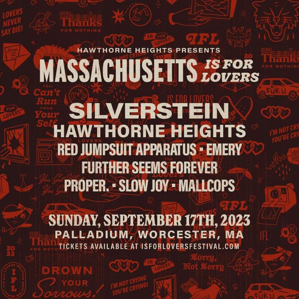 Hawthorne Heights’ “Massachusetts Is For Lovers” festival at the Xfinity Center in Mansfield, MA has been cancelled. Despite this, an abridged version of the event will now be held at The Palladium in Worcester, MA on September 17 with Silverstein, Hawthorne Heights, Red Jumpsuit Apparatus, Emery, Further Seems Forever, Proper., Slow Joy, and Mallcops set to perform.