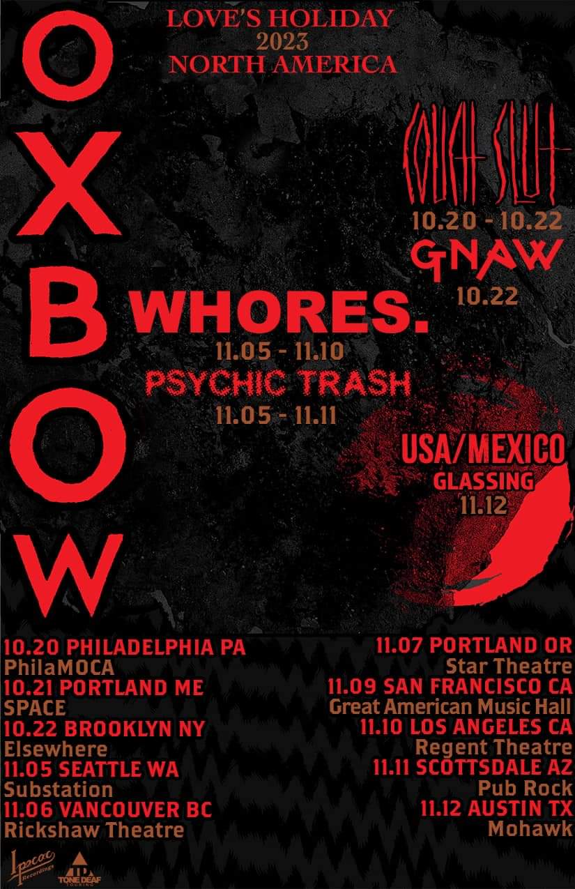 Oxbow have revealed the opening acts for their upcoming North American tour. Whores., Couch Slut, Psychic Trash, USA/MEXICO, Glassing, and Gnaw will join the band on select dates.