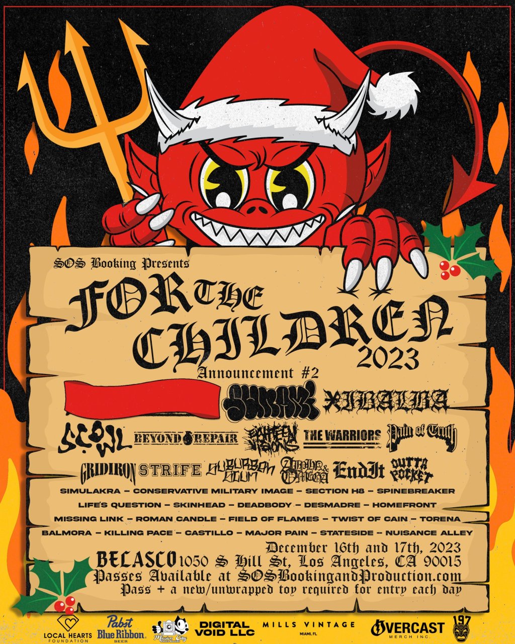 More bands have been added to this year’s For The Children festival. The event will take place at The Belasco in Los Angeles, CA on December 16-17 and it will now feature the following: Sunami, Xibalba, Beyond Repair, The Warriors, Strife, Scowl, Eighteen Visions, Pain Of Truth, Deadbody, Suburban Scum, Gridiron, Alpha & Omega, Simulakra, Concertavie Military Image, Skinhead, Home Front, Killing Pace, Twist Of Cain, Torena, Major Pain, Outta Pocket, End It, Life’s Question, Desmadre, Missing Link, Roman Candle, Field Of Dreams, Castillo, Stateside, and Nuisance Alley.