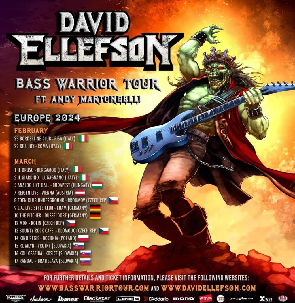 Former Megadeth bassist David Ellefson has announced the dates for his “Bass Warrior” European tour. The trek, which will find Ellefson joined by guitarist and musical director Andy Martongelli, drummer Roberto Pirami, vocalist Titta Tani, and guitarist Walter Cianciusi, will feature “cherished classics, deep cuts, and insightful storytelling.”