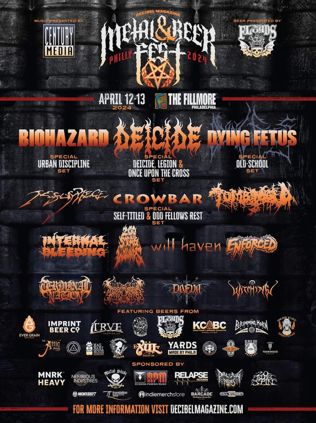 The lineup has been revealed for next year’s “Decibel Magazine Metal & Beer Fest” in Philadelphia , PA. The event will take place at The Fillmore on April 12-13 and it will feature: Biohazard (performing “Urban Discipline“), Deicide (“Deicide“, “Legion” & “Once Upon The Cross” set), Dying Fetus (old school set), Jesus Piece, Crowbar (“Crowbar” & “Odd Fellows” set), Tomb Mold, Internal Bleeding, 200 Stab Wounds, Will Haven, Enforced, Terminal Nation, Lamb Of Murmuur, Daeva, and Witching. The following breweries will also take part: 3 Floyds Brewing (IN), WarPigs Brewing (IN), TRVE Brewing (CO), Kings County Brewers Collective (NY), Black Sky Brewery (CO), Yards Brewing (PA), Magnanimous Brewing (FL), Ever Grain Brewing Co (PA), XUL Beer Company (TN), Adroit Theory Brewing (VA), New Trail Brewing Co (PA), Holy Mountain Brewing Co (WA), Imprint Beer Co (PA), Widowmaker Brewing (MA), Attic Brewing Co (PA), Bear Cult Brewing (DE), Brimming Horn Meadery (DE), and Tonewood Brewing (NJ).