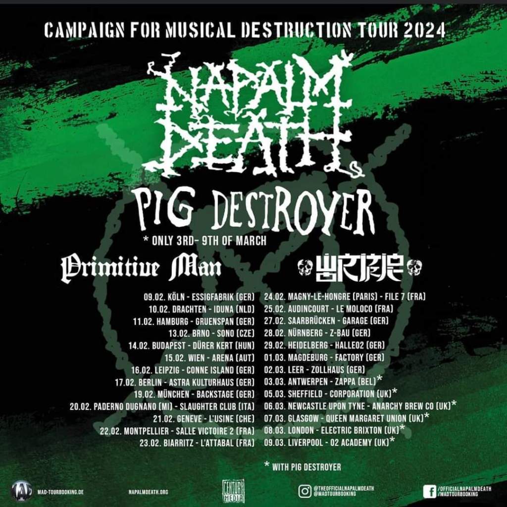 Napalm Death have announced a European/UK tour with Primitive Man and Wormrot. Pig Destroyer will also perform on select dates.