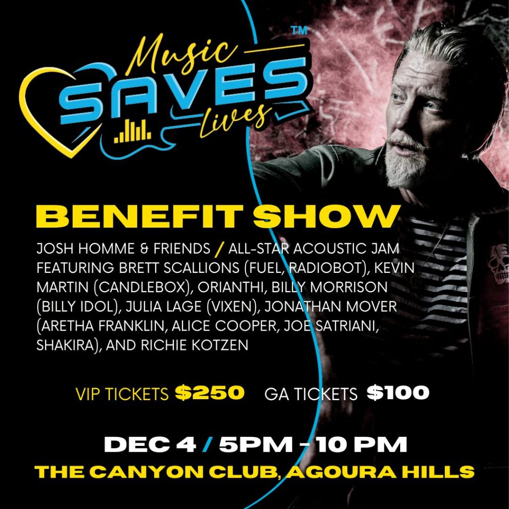 Josh Homme (Queens Of The Stone Age), Brett Scallions (ex-Fuel), Kevin Martin (Candlebox), Orianthi, Billy Morrison (Billy Idol), Julia Lage (Vixen), Jonathan Mover (Aretha Franklin, etc.), and Richie Kotzen will be performing at The Canyon in Agoura Hills, CA on December 4 as part of an acoustic benefit show. The event will raise money for Suicide Awareness Voices Of Education.