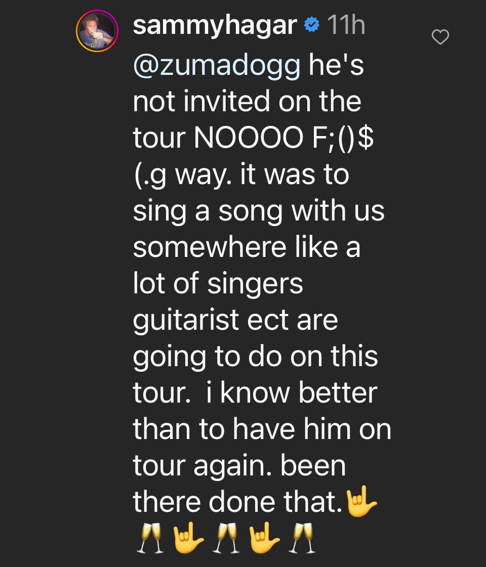 “He can come out and sing a song on a show or two, if he can remember the words. He’s not invited on the tour NOOO F;()$(.g way. It was to sing a song with us somewhere like a lot of singers guitarist ect are going to do on this tour. I know better than to have him on tour again. Been there done that.”