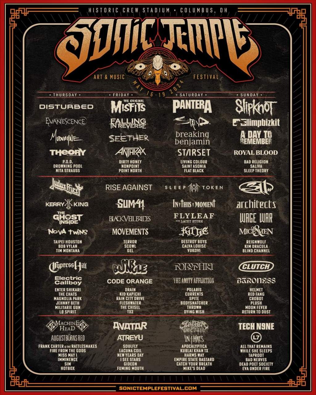 May 16: Disturbed, Evanescence, Mudvayne, Theory Of A Deadman, P.O.D., Drowning Pool, Nita Strauss, Judas Priest, Kerry King, The Ghost Inside, Nova Twins, Taipei Houston, Bob Vylan, Tim Montana, Cypress Hill, Electric Callboy, Enter Shikari, The Chats, Magnolia Park, Jehnny Beth, Militarie Gun, Lo Spirit, Machine Head, August Burns Red, Frank Carter And The Rattlesnakes, Fire From The Gods, Miss May I, Imminence, SIM, and Hotbox.